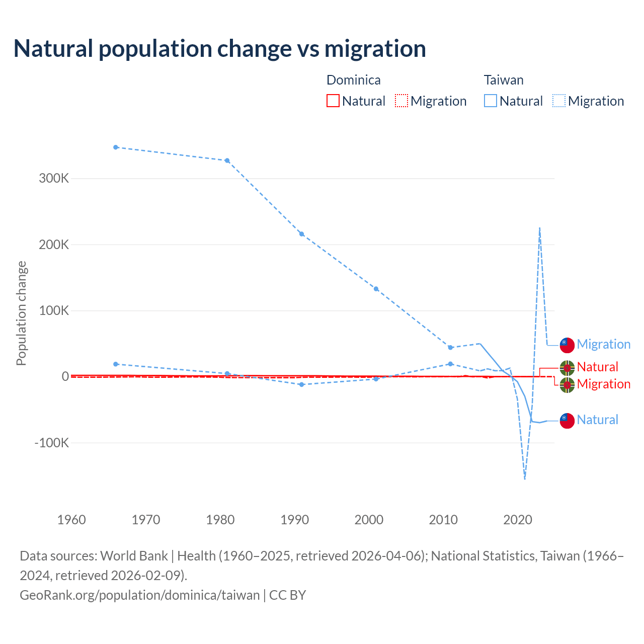 Over the last 10 years, 4.63% of the population change in Dominica is from natural causes (a loss of 190 people) and 95.4% is from migration (a loss of 3,914 people). In Taiwan 56.7% is from natural causes (a loss of 57,467 people) and 43.3% is from migration (a gain of 43,884 people).
