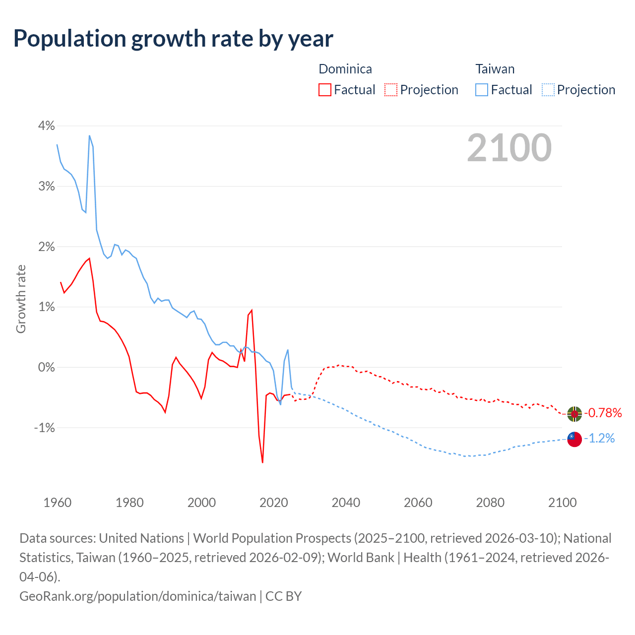 - For the last 10 years, Dominica has had an average growth rate of -0.47% per year vs -0.03% in Taiwan.