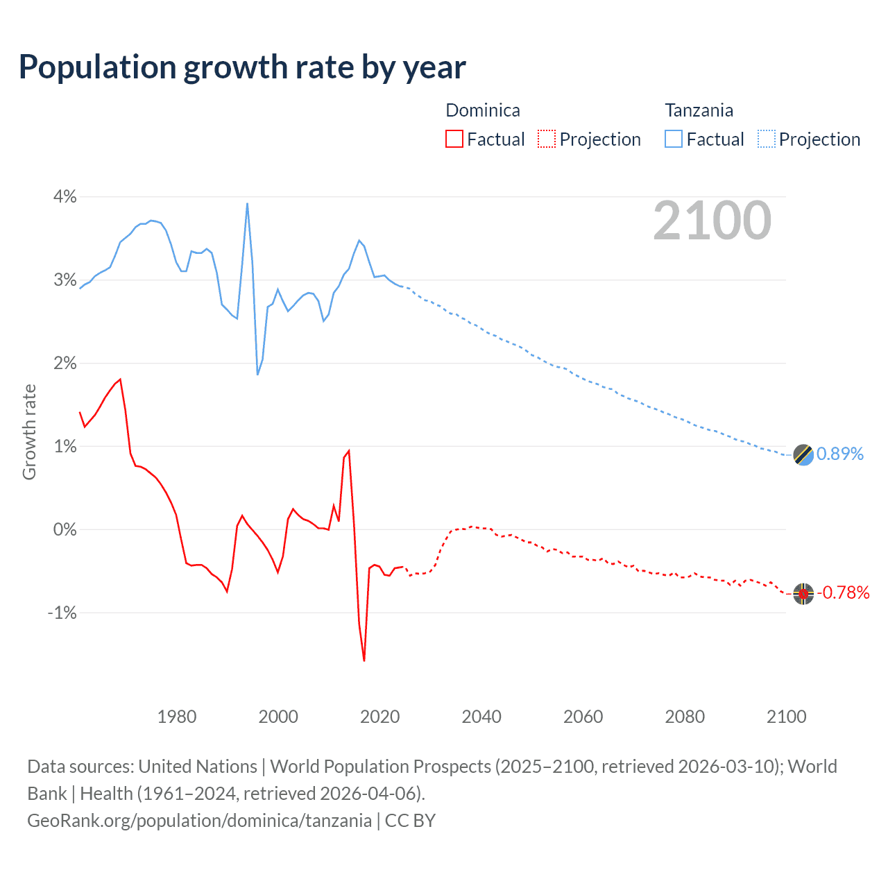 - For the last 10 years, Dominica has had an average growth rate of -0.47% per year vs +3.13% in Tanzania.