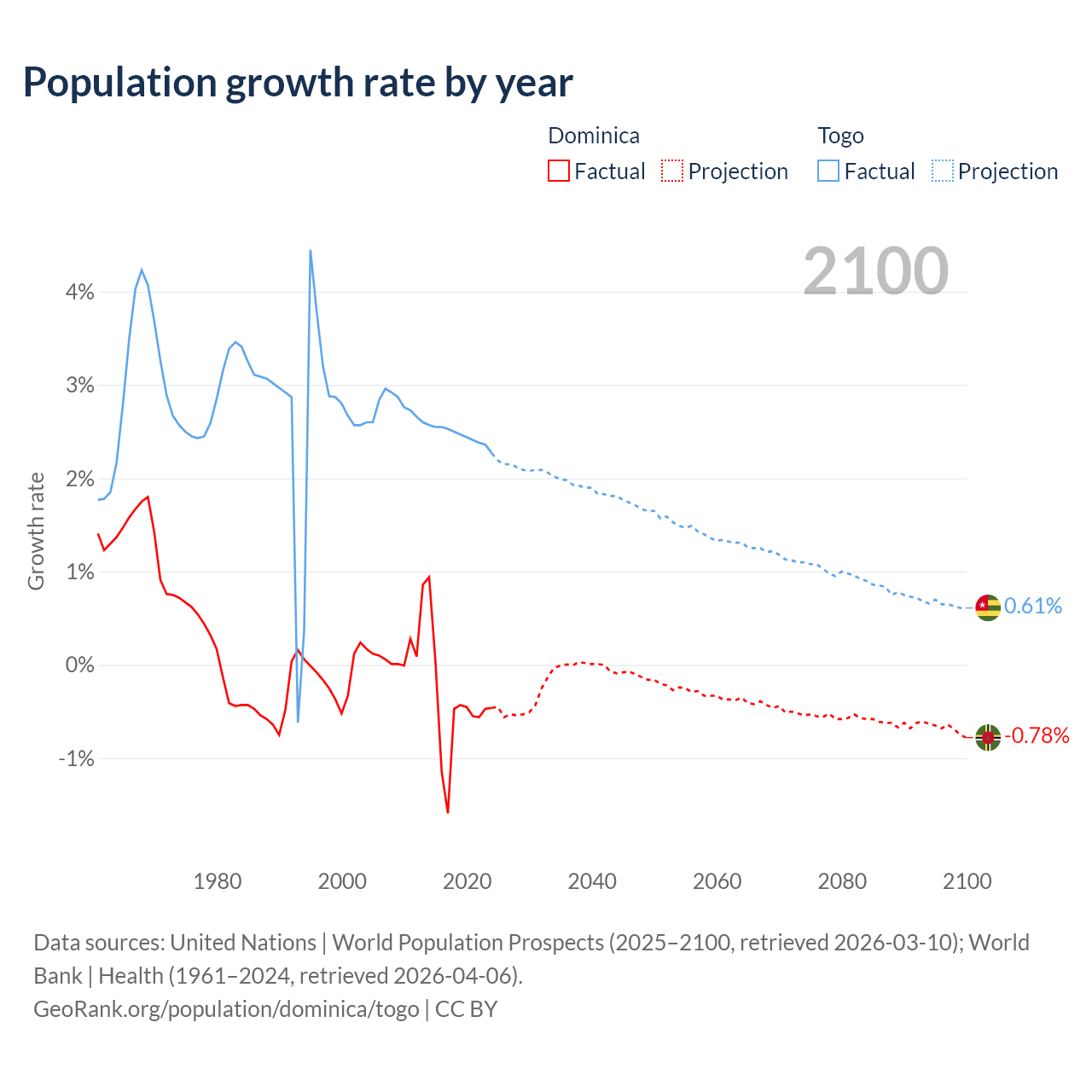- For the last 10 years, Dominica has had an average growth rate of -0.47% per year vs +2.46% in Togo.
