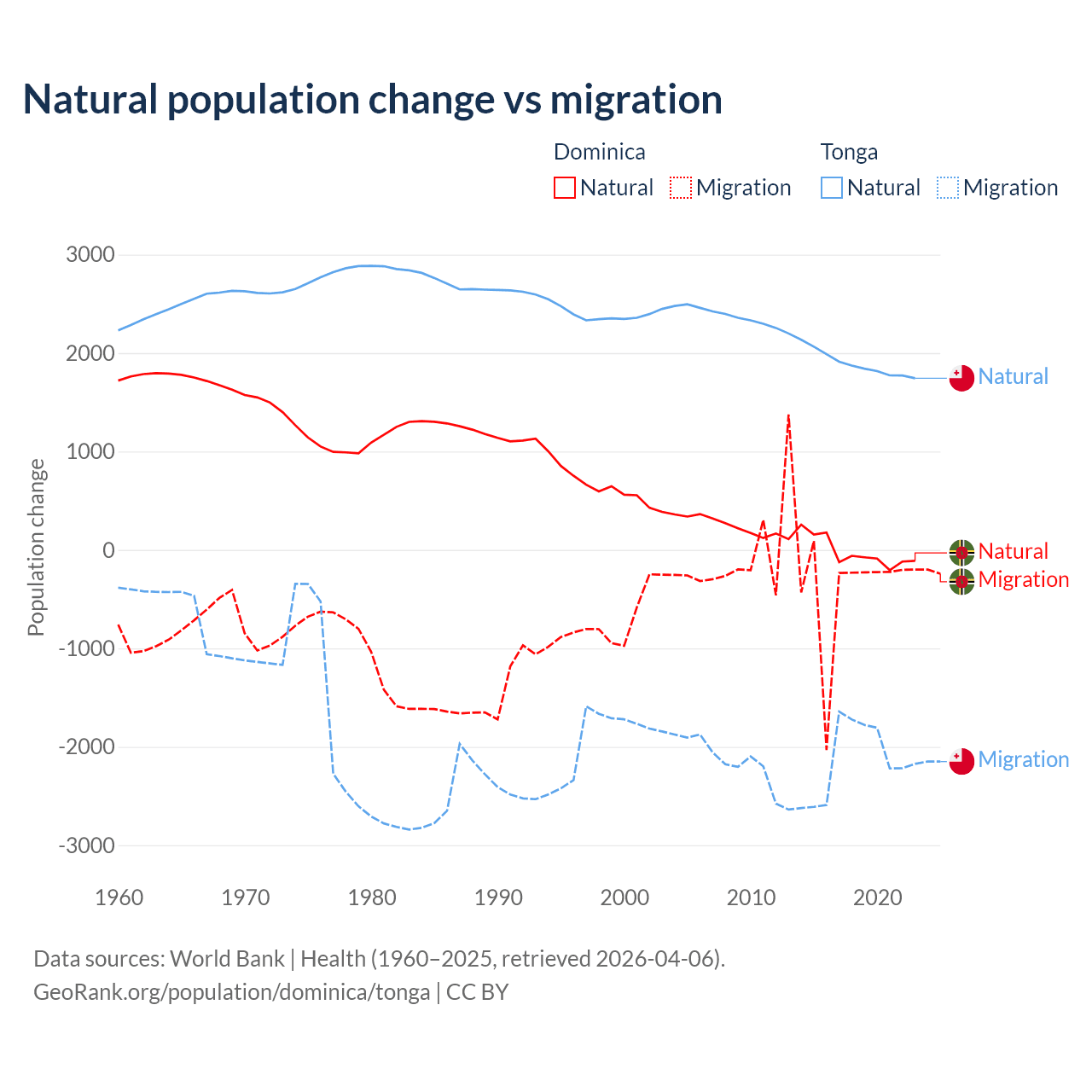 Over the last 10 years, 4.63% of the population change in Dominica is from natural causes (a loss of 190 people) and 95.4% is from migration (a loss of 3,914 people). In Tonga 46.9% is from natural causes (a gain of 18,919 people) and 53.1% is from migration (a loss of 21,384 people).