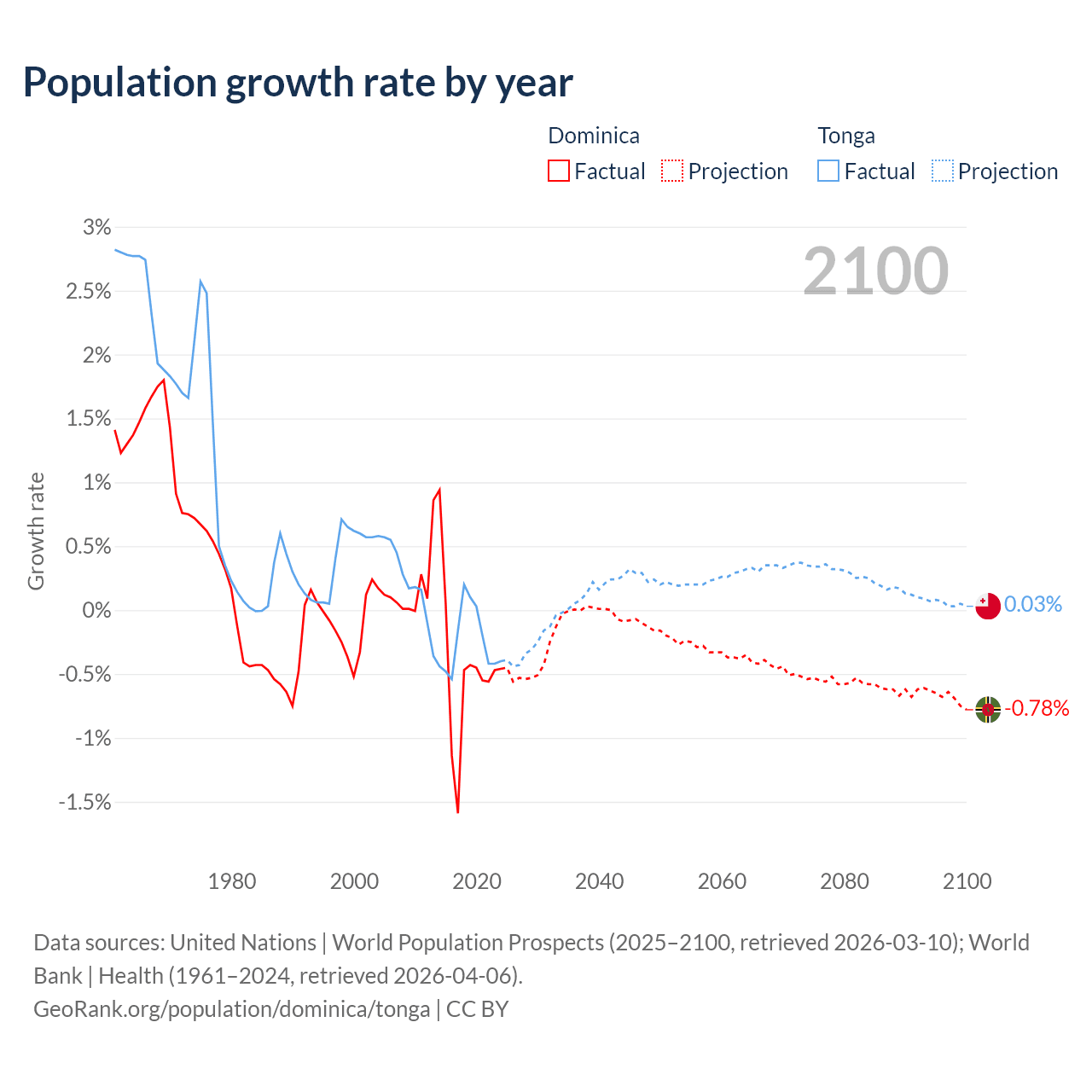 - For the last 10 years, Dominica has had an average growth rate of -0.47% per year vs -0.25% in Tonga.