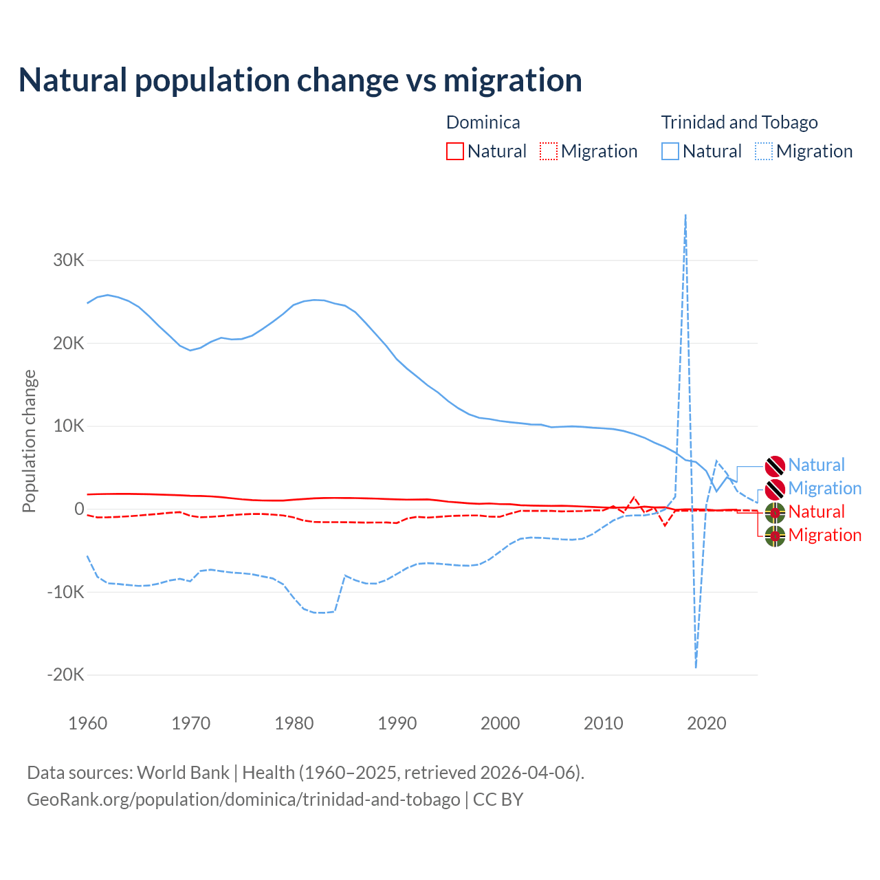 Over the last 10 years, 4.63% of the population change in Dominica is from natural causes (a loss of 190 people) and 95.4% is from migration (a loss of 3,914 people). In Trinidad and Tobago 66% is from natural causes (a gain of 55,887 people) and 34% is from migration (a gain of 28,785 people).