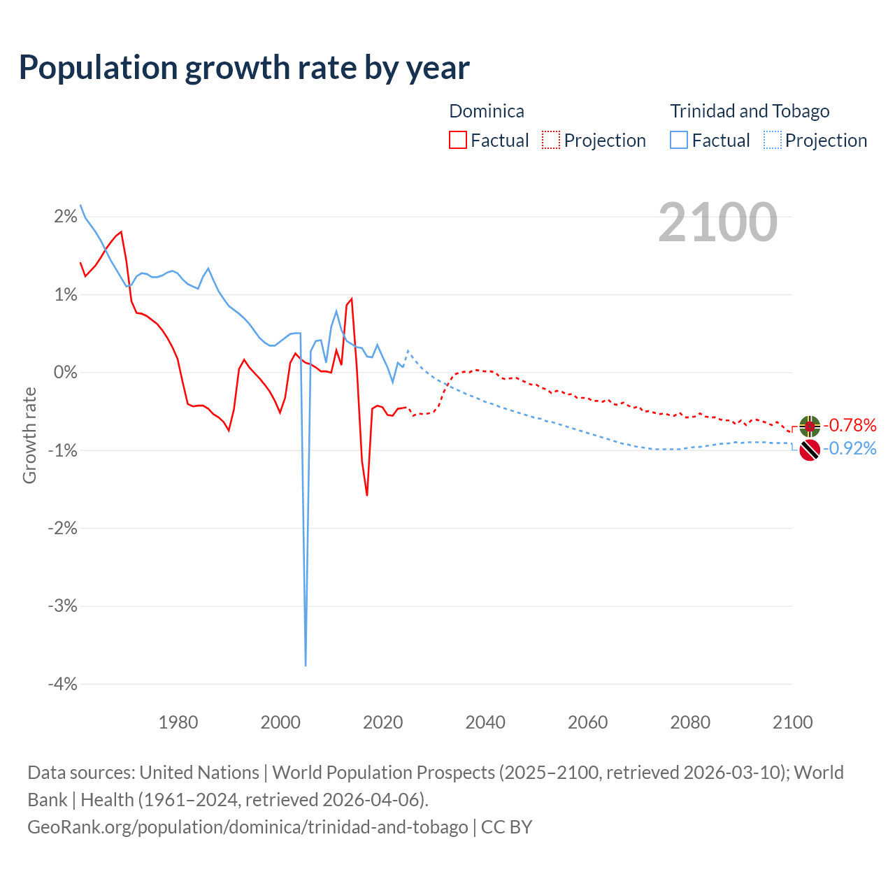 - For the last 10 years, Dominica has had an average growth rate of -0.47% per year vs +0.19% in Trinidad and Tobago.