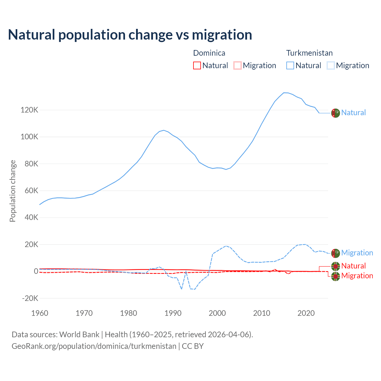 Over the last 10 years, 4.63% of the population change in Dominica is from natural causes (a loss of 190 people) and 95.4% is from migration (a loss of 3,914 people). In Turkmenistan 89.2% is from natural causes (a gain of 1,270,228 people) and 10.8% is from migration (a gain of 154,379 people).
