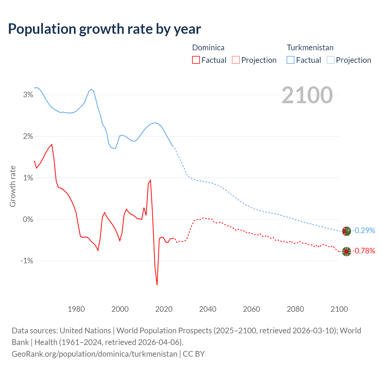 - For the last 10 years, Dominica has had an average growth rate of -0.47% per year vs +2.14% in Turkmenistan.