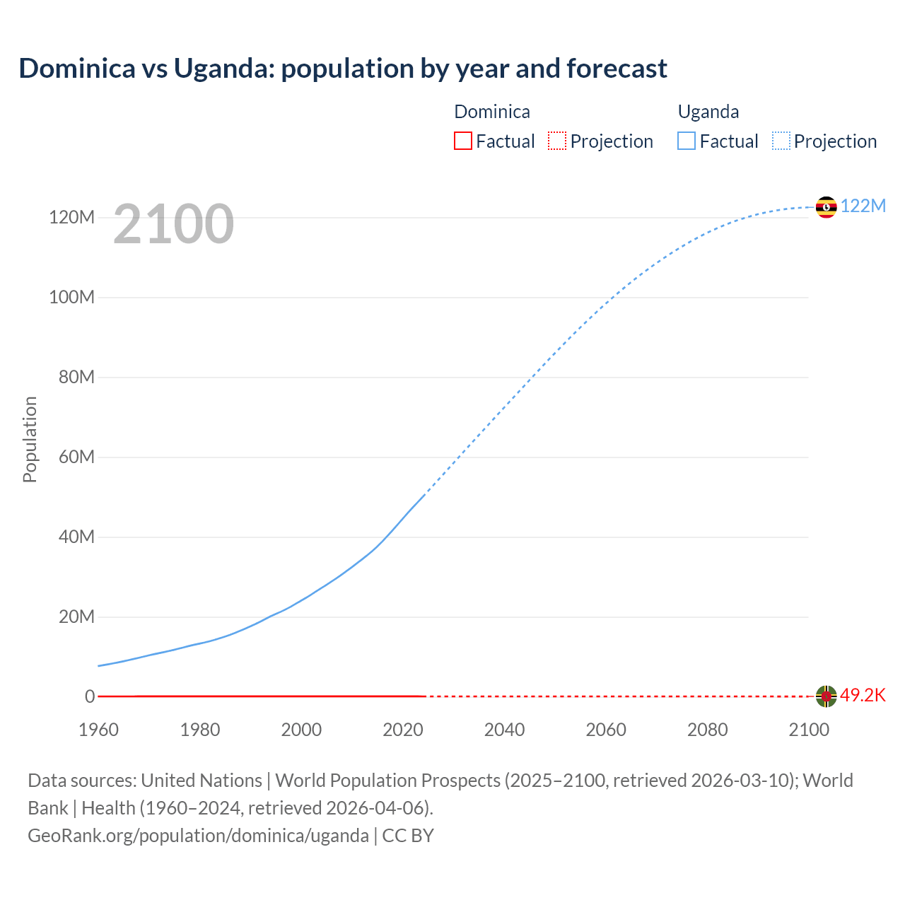 The latest officially reported population of Dominica was 66,205 in 2024 vs 50,015,092 people in Uganda in 2024. In 2026, based on the adjusted UN estimation, the current Dominica's population is 65,539 people compared to 53,170,946 in Uganda.