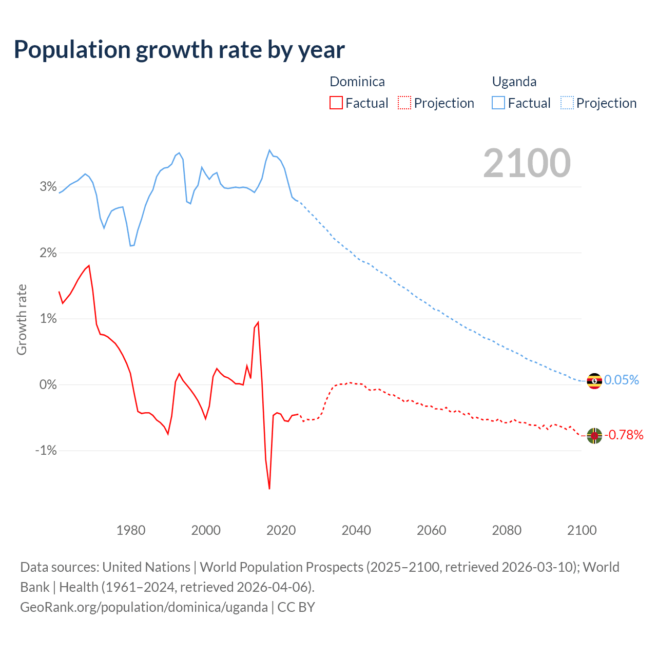 - For the last 10 years, Dominica has had an average growth rate of -0.47% per year vs +3.21% in Uganda.