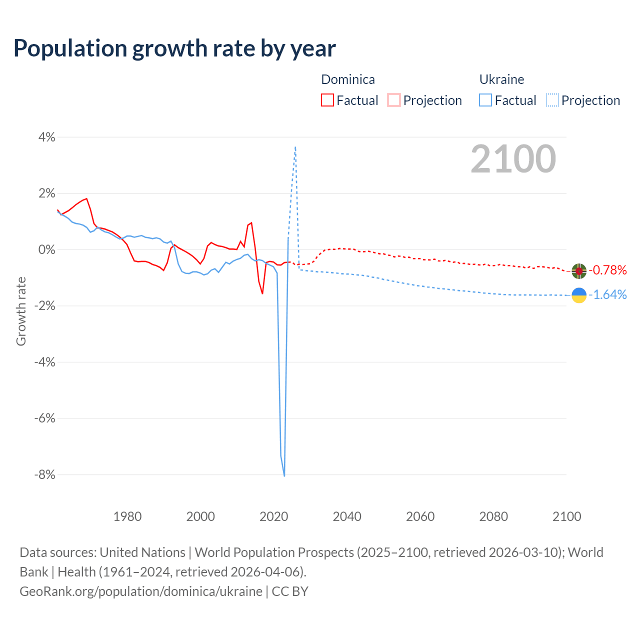 - For the last 10 years, Dominica has had an average growth rate of -0.47% per year vs -1.74% in Ukraine.