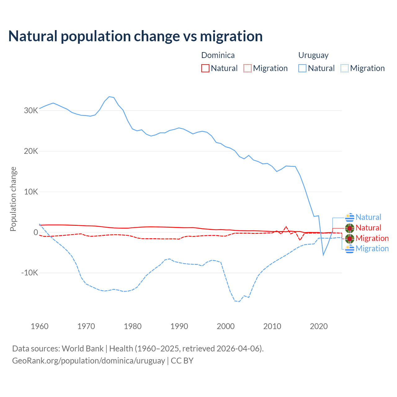 Over the last 10 years, 4.63% of the population change in Dominica is from natural causes (a loss of 190 people) and 95.4% is from migration (a loss of 3,914 people). In Uruguay 70% is from natural causes (a gain of 64,303 people) and 30% is from migration (a loss of 27,501 people).