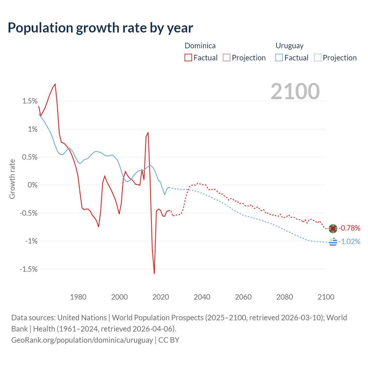 - For the last 10 years, Dominica has had an average growth rate of -0.47% per year vs +0.11% in Uruguay.