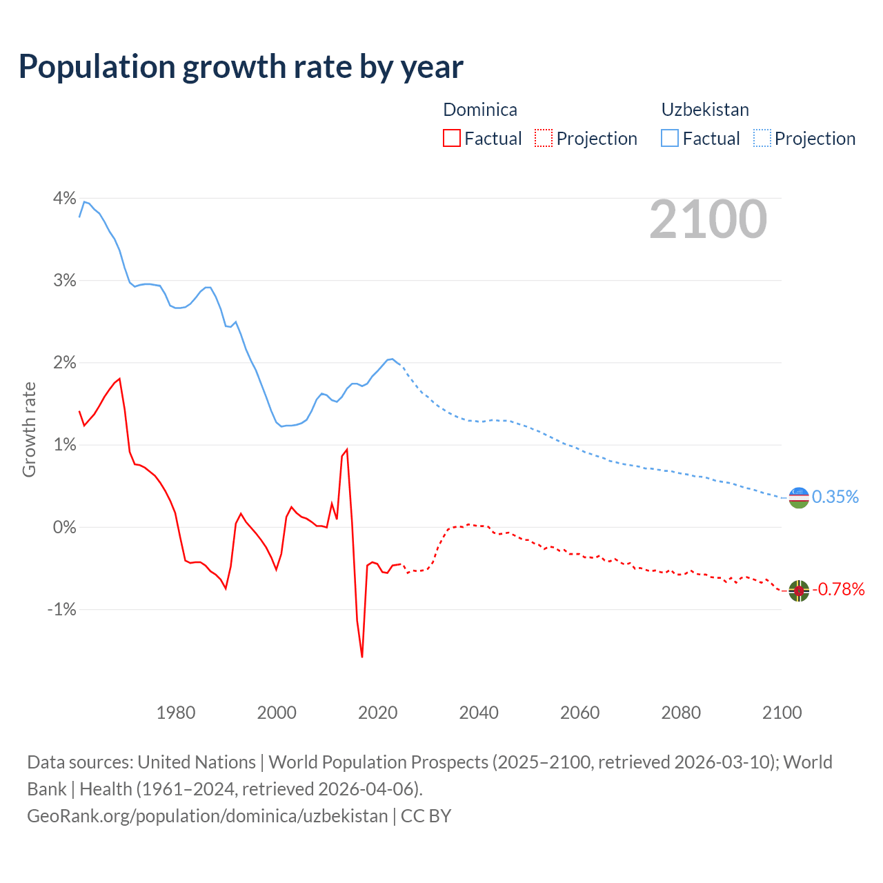 - For the last 10 years, Dominica has had an average growth rate of -0.47% per year vs +1.85% in Uzbekistan.