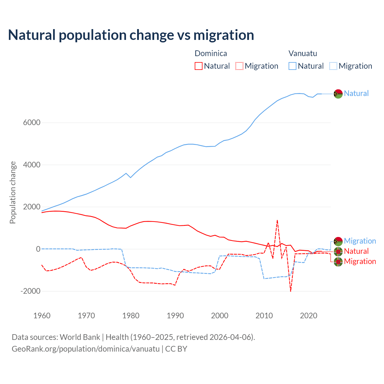 Over the last 10 years, 4.63% of the population change in Dominica is from natural causes (a loss of 190 people) and 95.4% is from migration (a loss of 3,914 people). In Vanuatu 92.2% is from natural causes (a gain of 72,941 people) and 7.81% is from migration (a loss of 6,181 people).