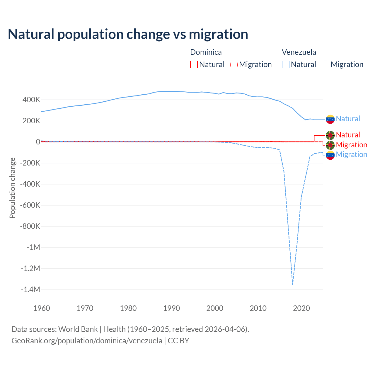 Over the last 10 years, 4.63% of the population change in Dominica is from natural causes (a loss of 190 people) and 95.4% is from migration (a loss of 3,914 people). In Venezuela 38.6% is from natural causes (a gain of 2,946,257 people) and 61.4% is from migration (a loss of 4,683,227 people).