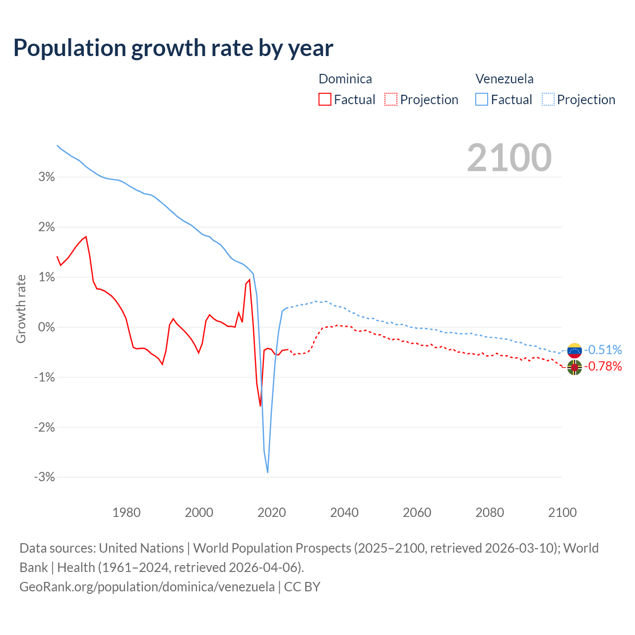 - For the last 10 years, Dominica has had an average growth rate of -0.47% per year vs -0.46% in Venezuela.