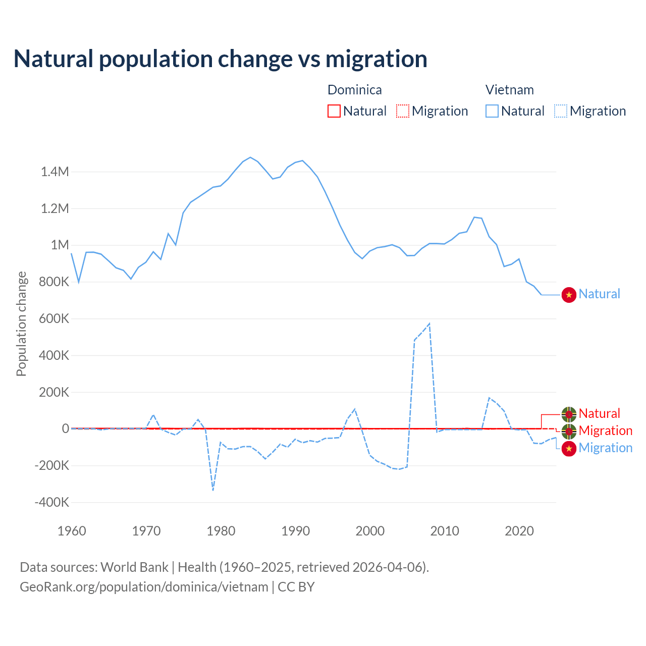 Over the last 10 years, 4.63% of the population change in Dominica is from natural causes (a loss of 190 people) and 95.4% is from migration (a loss of 3,914 people). In Vietnam 97.7% is from natural causes (a gain of 9,349,756 people) and 2.29% is from migration (a gain of 219,073 people).