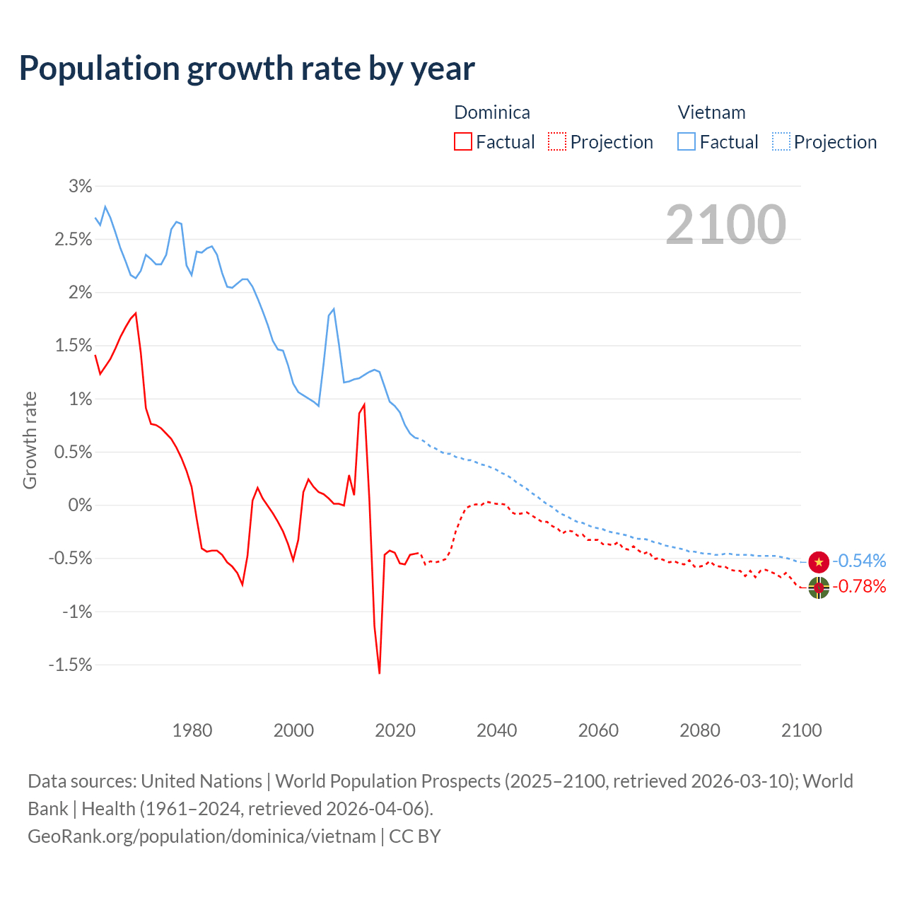 - For the last 10 years, Dominica has had an average growth rate of -0.47% per year vs +0.99% in Vietnam.
