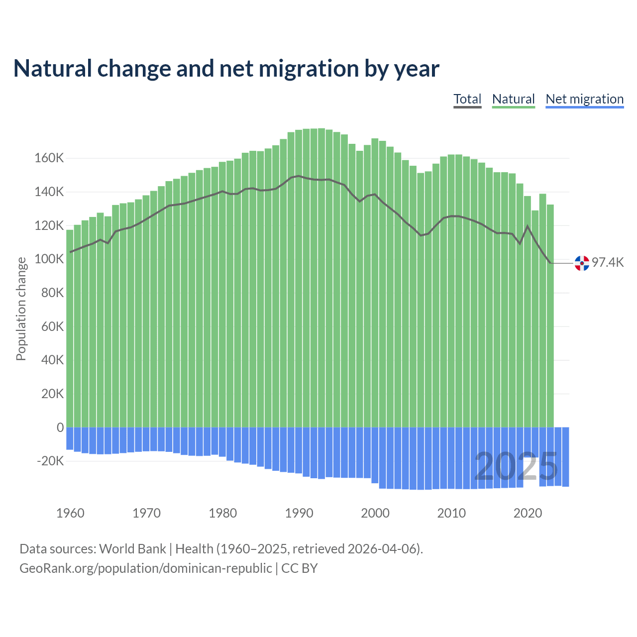 Over the last 10 years, 81.8% of the population change in the Dominican Republic is from natural causes (a gain of 1,447,764 people) and 18.2% is from migration (a loss of 322,919 people).
