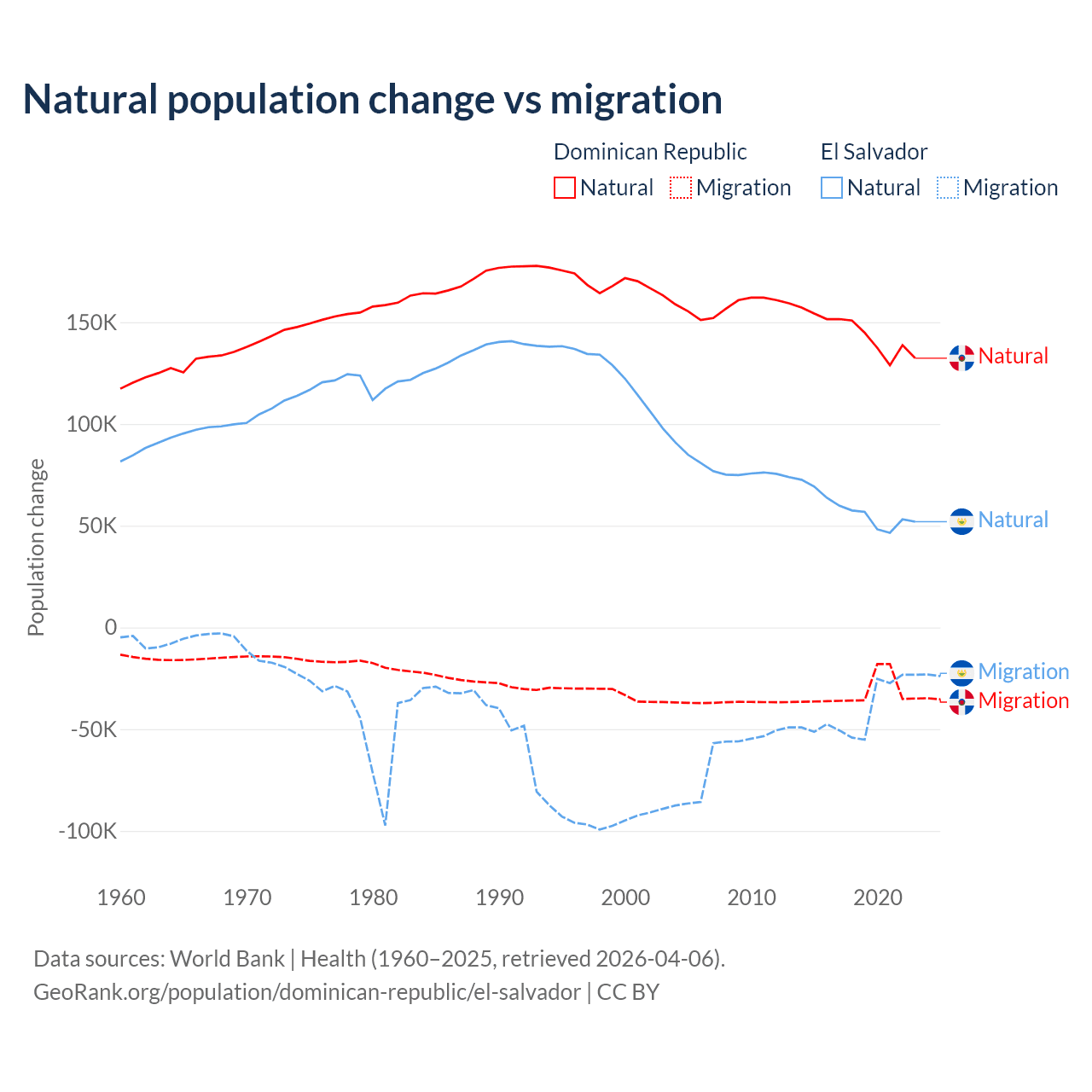 Over the last 10 years, 81.8% of the population change in the Dominican Republic is from natural causes (a gain of 1,447,764 people) and 18.2% is from migration (a loss of 322,919 people). In El Salvador 58.8% is from natural causes (a gain of 579,641 people) and 41.2% is from migration (a loss of 406,874 people).