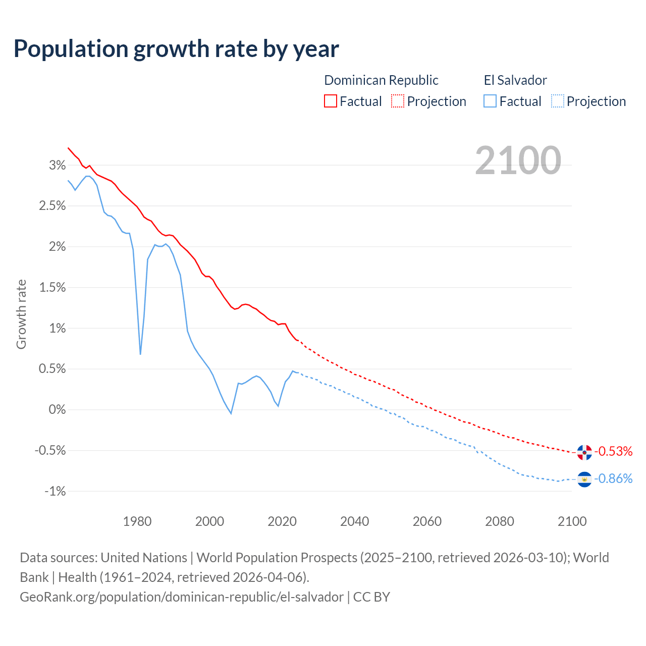 - For the last 10 years, the Dominican Republic has had an average growth rate of +1.04% per year vs +0.29% in El Salvador.