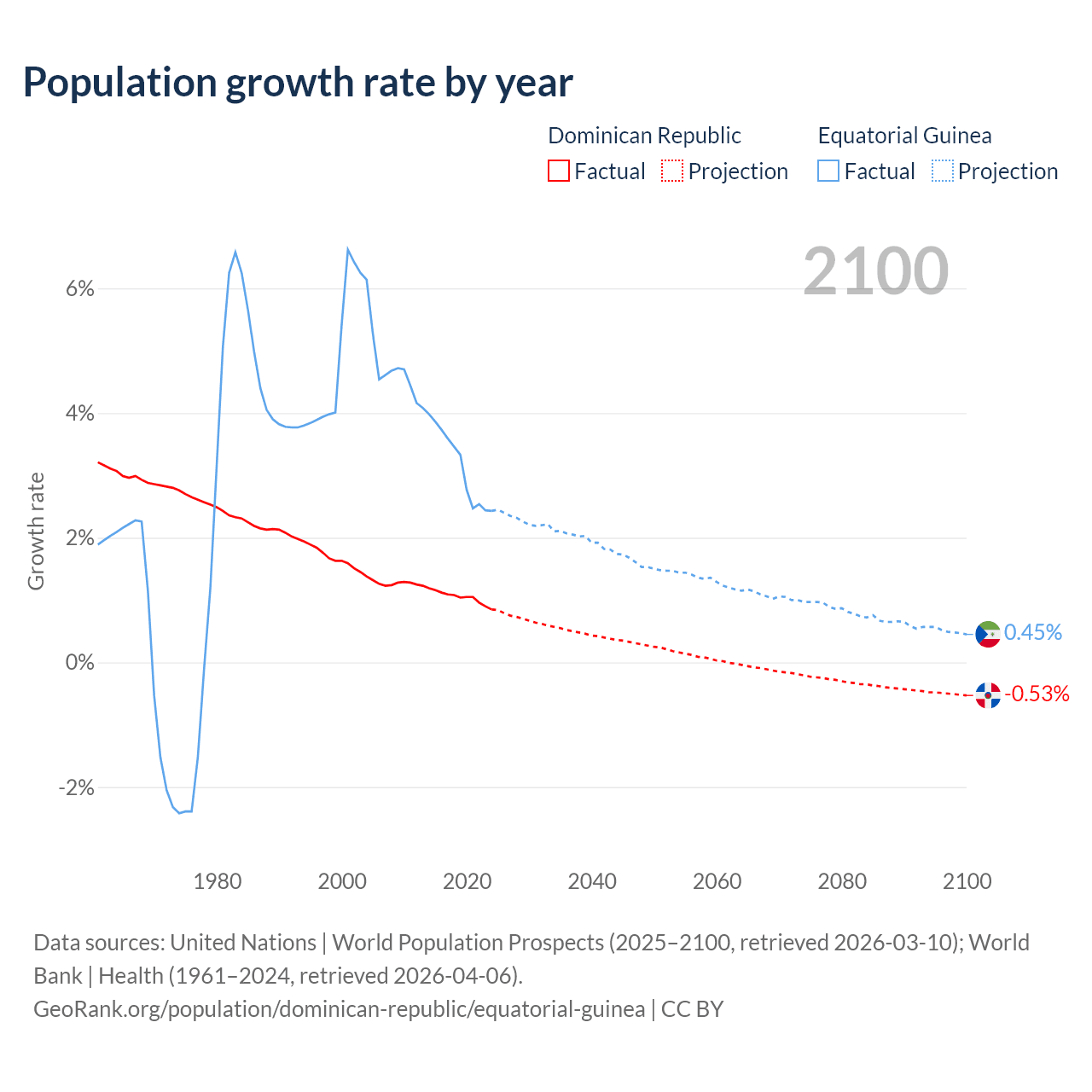 - For the last 10 years, the Dominican Republic has had an average growth rate of +1.04% per year vs +3.15% in Equatorial Guinea.