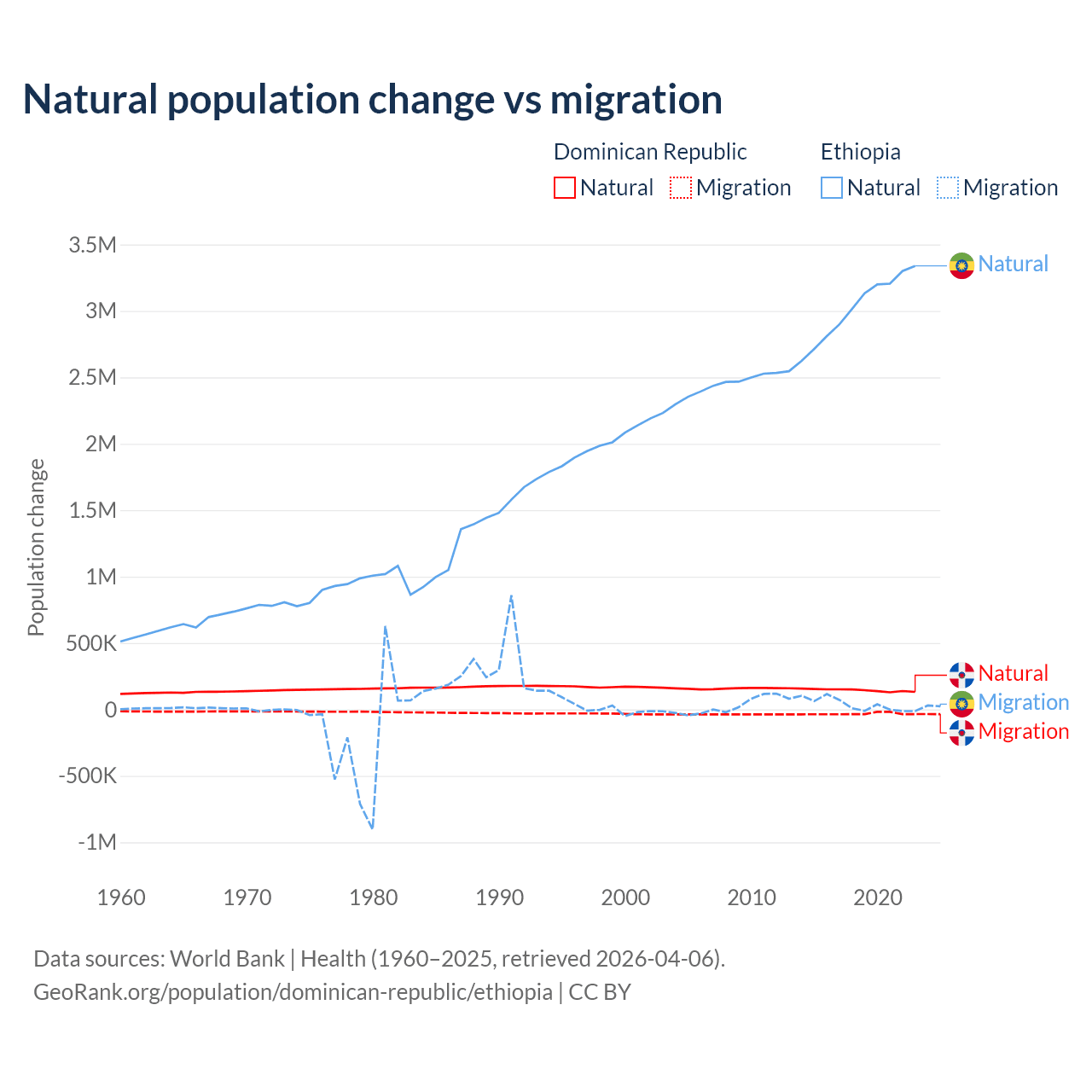 Over the last 10 years, 81.8% of the population change in the Dominican Republic is from natural causes (a gain of 1,447,764 people) and 18.2% is from migration (a loss of 322,919 people). In Ethiopia 98.8% is from natural causes (a gain of 30,237,373 people) and 1.19% is from migration (a gain of 365,488 people).