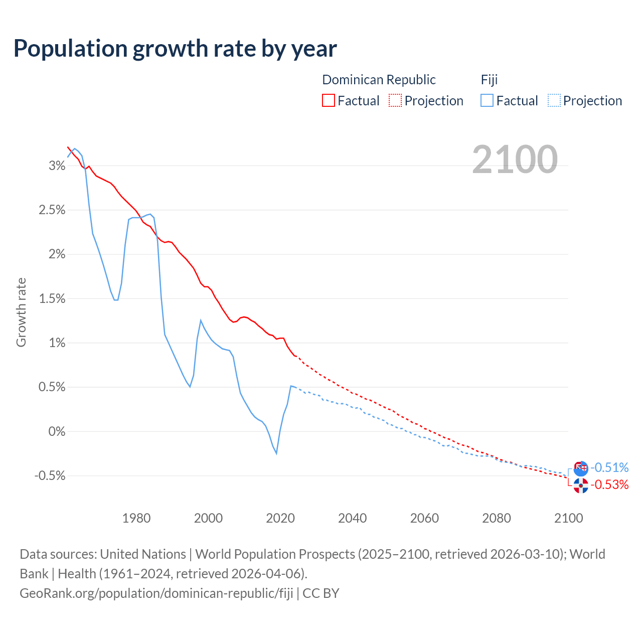 - For the last 10 years, the Dominican Republic has had an average growth rate of +1.04% per year vs +0.12% in Fiji.