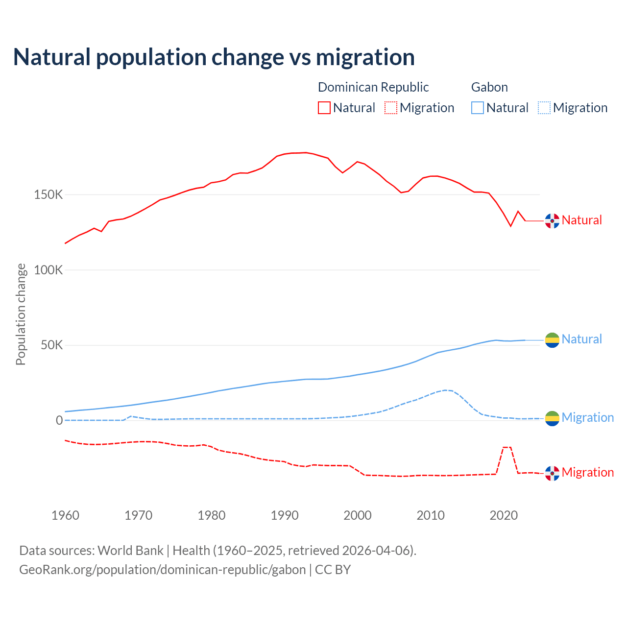 Over the last 10 years, 81.8% of the population change in the Dominican Republic is from natural causes (a gain of 1,447,764 people) and 18.2% is from migration (a loss of 322,919 people). In Gabon 91.1% is from natural causes (a gain of 515,484 people) and 8.86% is from migration (a gain of 50,119 people).