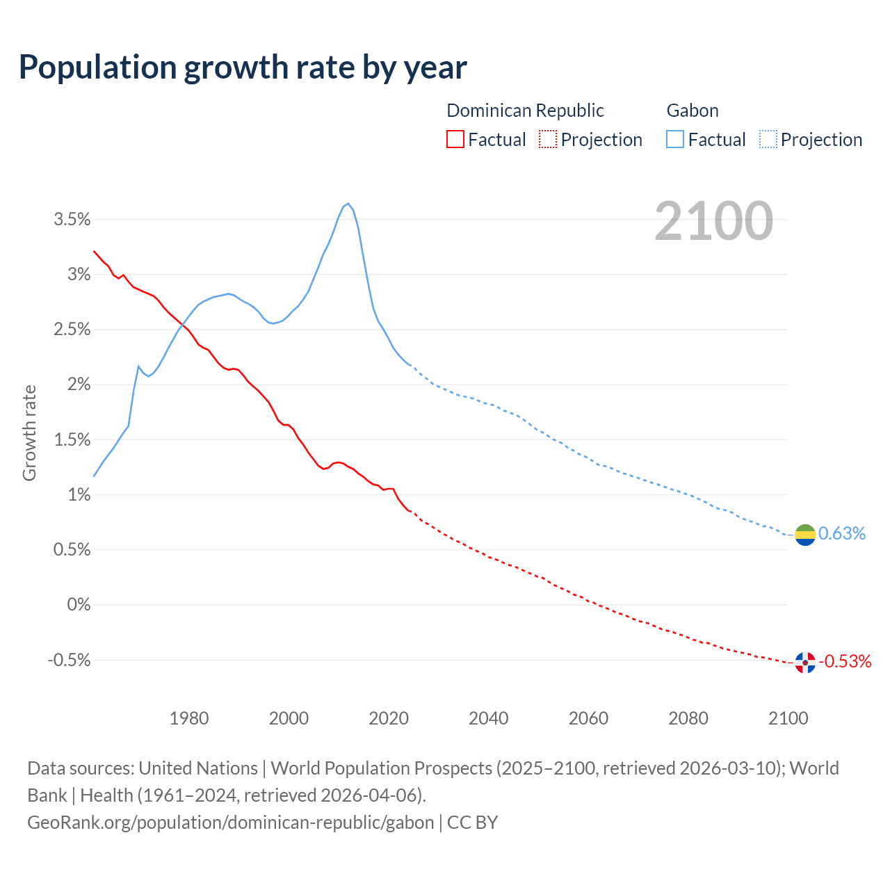 Dominican Republic vs Gabon: population by year and forecast