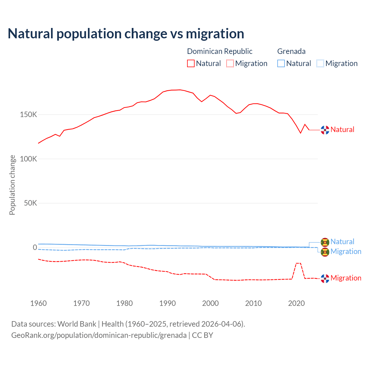 Over the last 10 years, 81.8% of the population change in the Dominican Republic is from natural causes (a gain of 1,447,764 people) and 18.2% is from migration (a loss of 322,919 people). In Grenada 76% is from natural causes (a gain of 4,850 people) and 24% is from migration (a loss of 1,535 people).