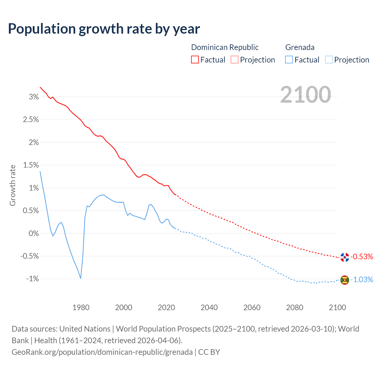 Dominican Republic vs Grenada: population by year and forecast