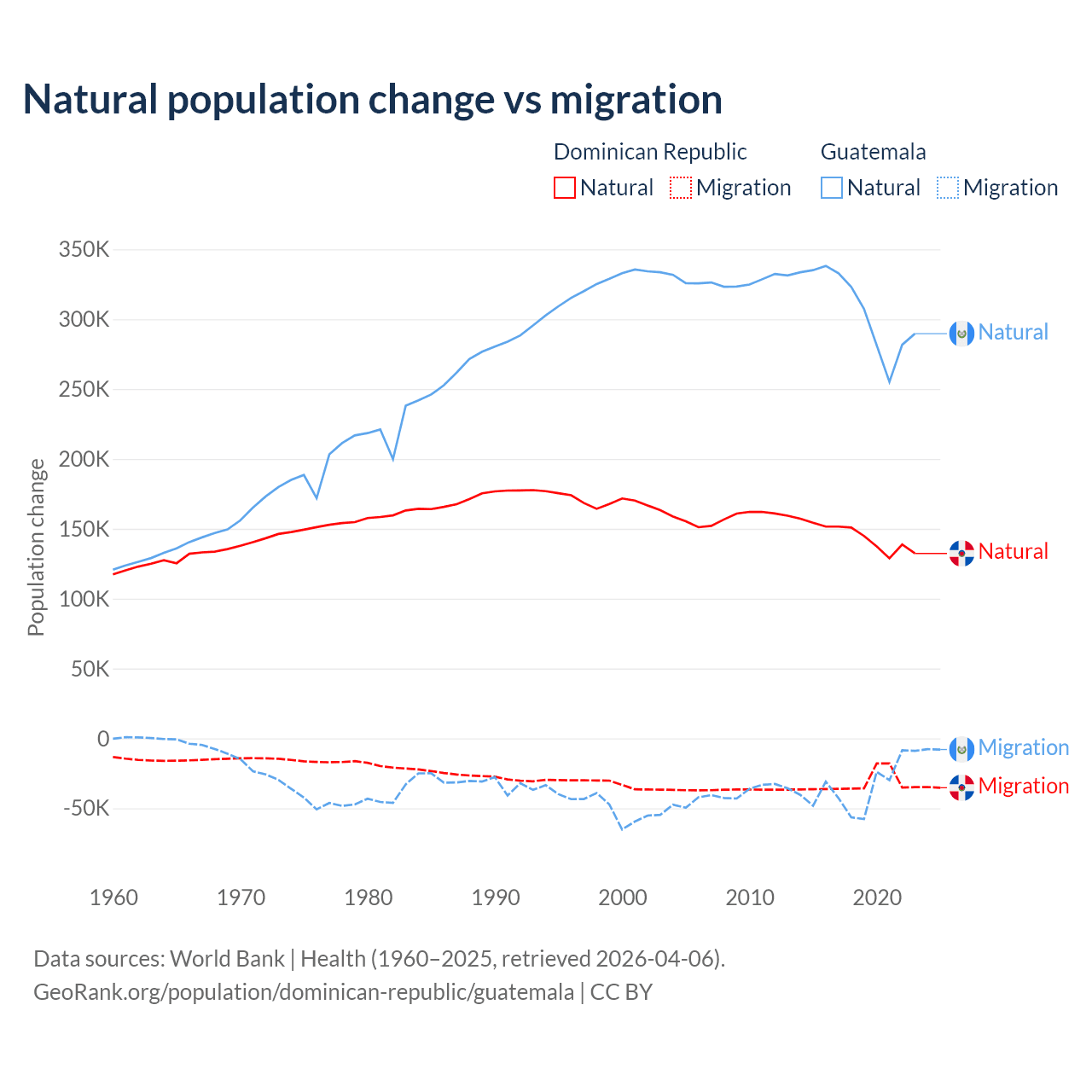 Over the last 10 years, 81.8% of the population change in the Dominican Republic is from natural causes (a gain of 1,447,764 people) and 18.2% is from migration (a loss of 322,919 people). In Guatemala 89.8% is from natural causes (a gain of 3,077,847 people) and 10.2% is from migration (a loss of 347,818 people).