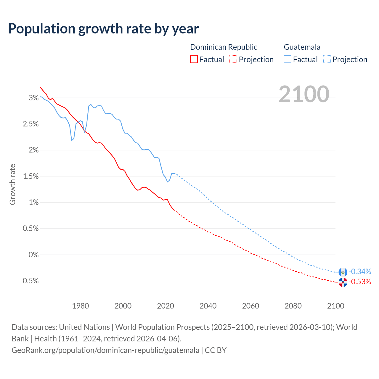 - For the last 10 years, the Dominican Republic has had an average growth rate of +1.04% per year vs +1.64% in Guatemala.