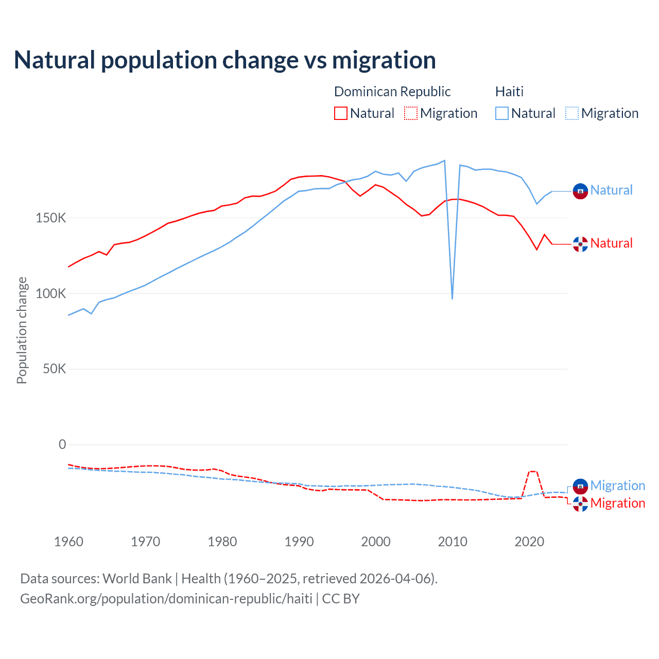 Over the last 10 years, 81.8% of the population change in the Dominican Republic is from natural causes (a gain of 1,447,764 people) and 18.2% is from migration (a loss of 322,919 people). In Haiti 83.9% is from natural causes (a gain of 1,740,319 people) and 16.1% is from migration (a loss of 333,076 people).