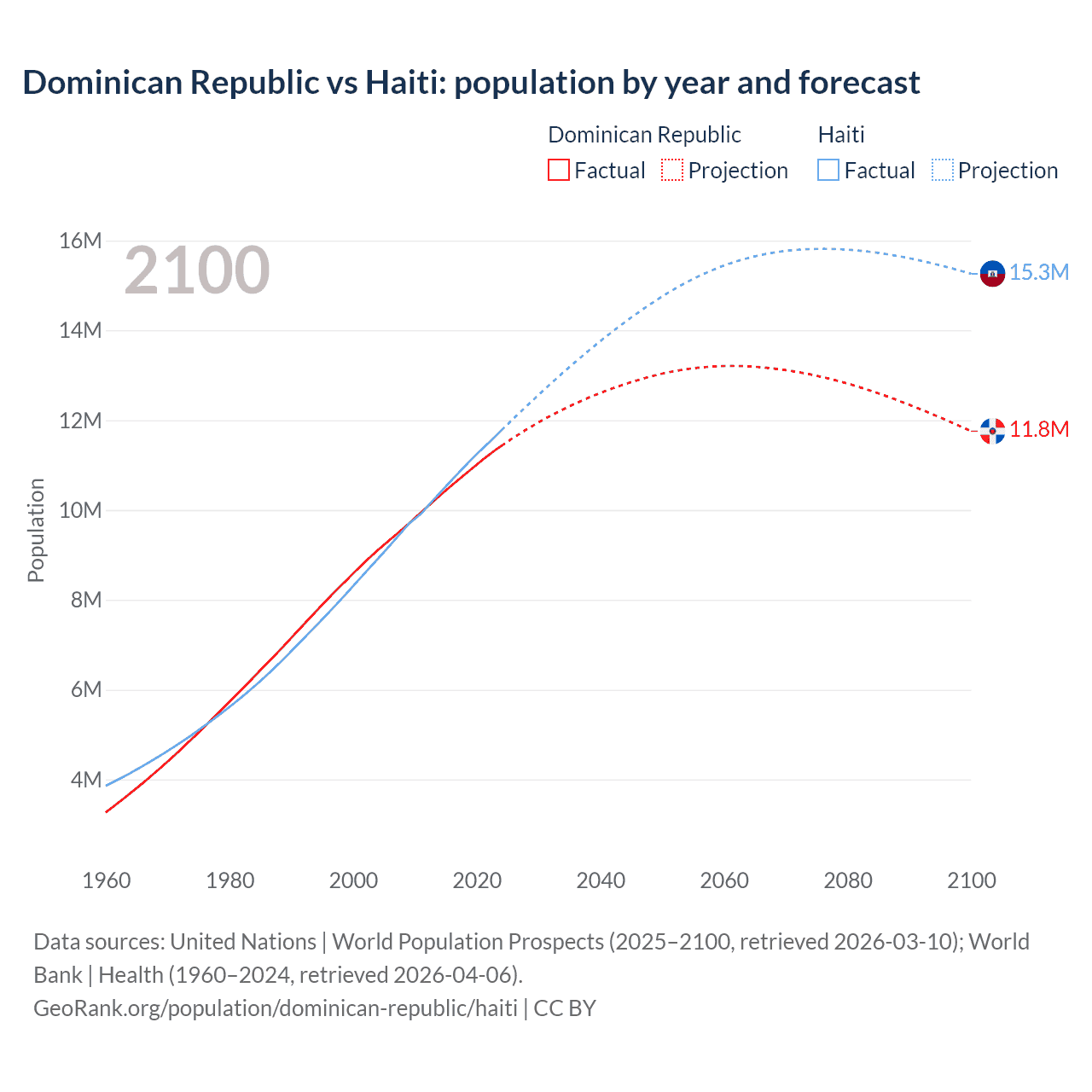 The latest officially reported population of the Dominican Republic was 11,427,557 in 2024 vs 11,772,557 people in Haiti in 2024. In 2026, based on the adjusted UN estimation, the current Dominican Republic's population is 11,637,906 people compared to 12,076,663 in Haiti.