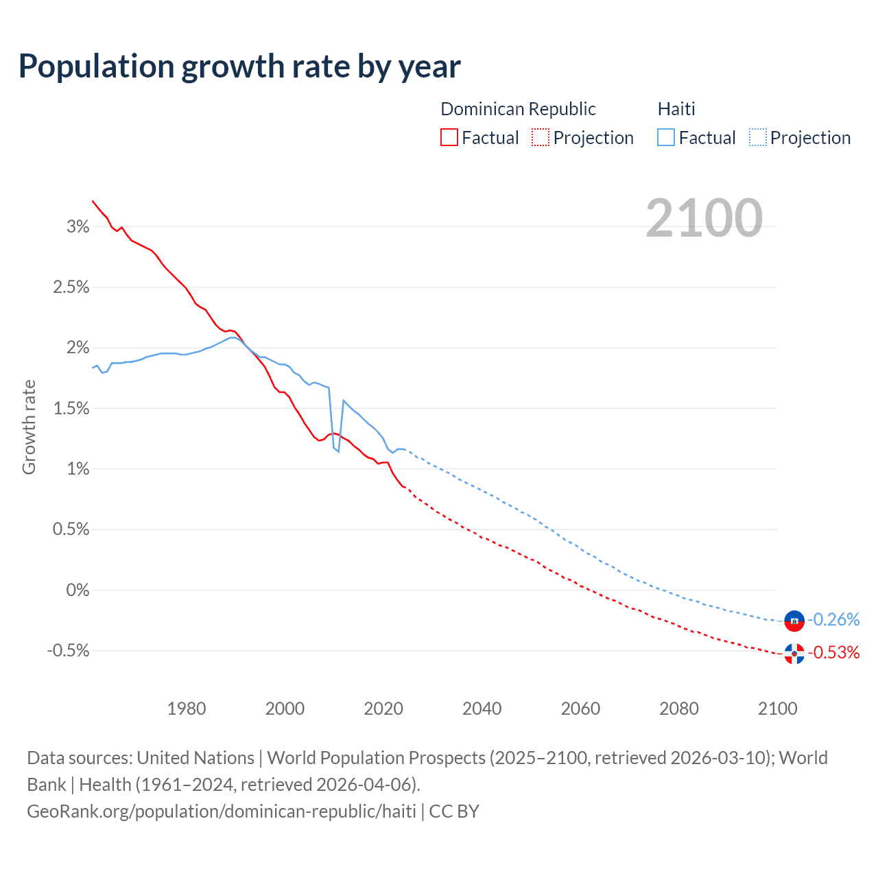 - For the last 10 years, the Dominican Republic has had an average growth rate of +1.04% per year vs +1.29% in Haiti.