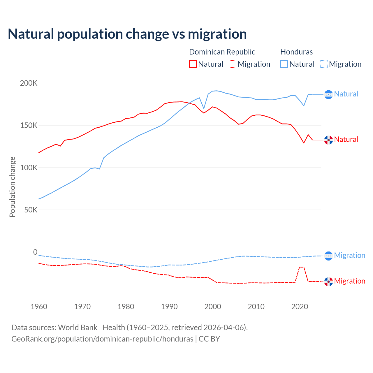 Over the last 10 years, 81.8% of the population change in the Dominican Republic is from natural causes (a gain of 1,447,764 people) and 18.2% is from migration (a loss of 322,919 people). In Honduras 96.7% is from natural causes (a gain of 1,821,125 people) and 3.29% is from migration (a loss of 61,965 people).