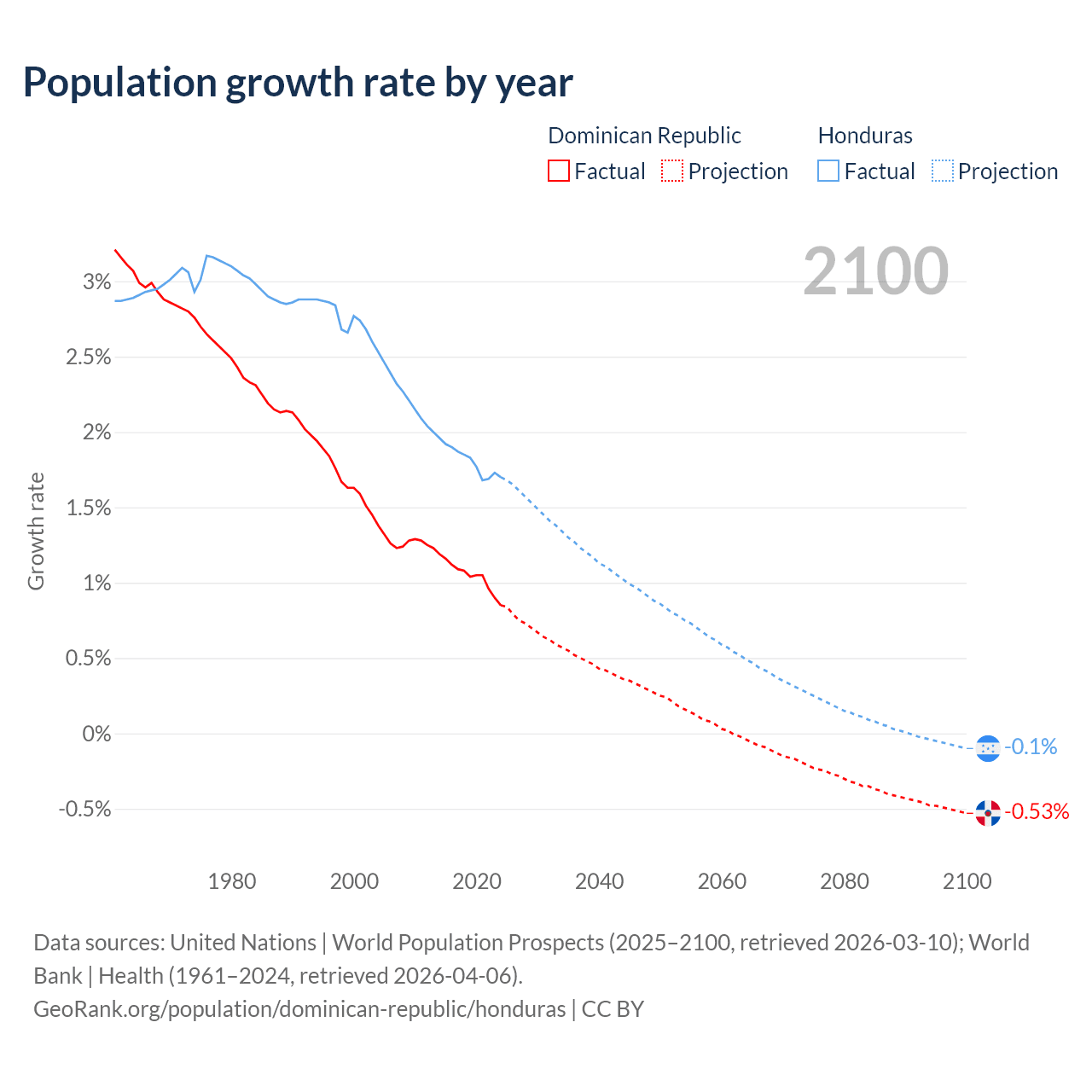 - For the last 10 years, the Dominican Republic has had an average growth rate of +1.04% per year vs +1.81% in Honduras.