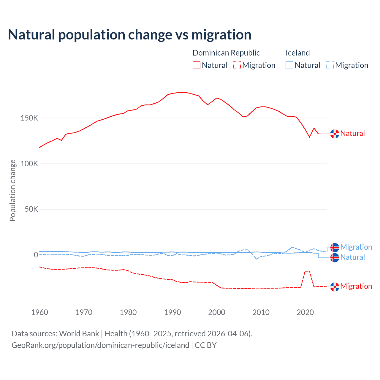 Over the last 10 years, 81.8% of the population change in the Dominican Republic is from natural causes (a gain of 1,447,764 people) and 18.2% is from migration (a loss of 322,919 people). In Iceland 30.7% is from natural causes (a gain of 20,128 people) and 69.3% is from migration (a gain of 45,356 people).