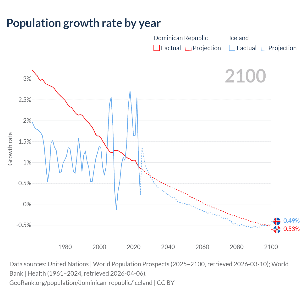 - For the last 10 years, the Dominican Republic has had an average growth rate of +1.04% per year vs +1.63% in Iceland.