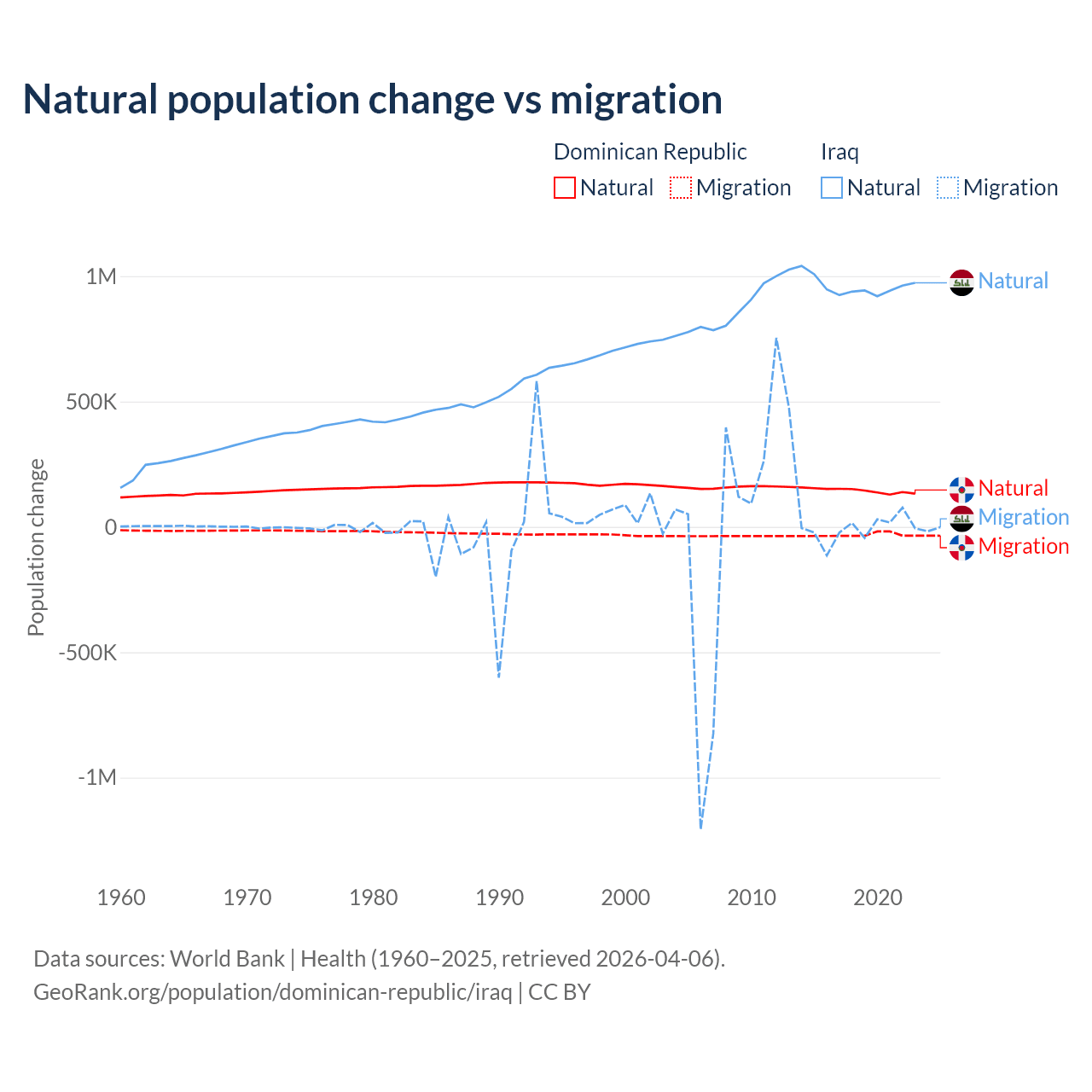 Over the last 10 years, 81.8% of the population change in the Dominican Republic is from natural causes (a gain of 1,447,764 people) and 18.2% is from migration (a loss of 322,919 people). In Iraq 99.2% is from natural causes (a gain of 9,598,842 people) and 0.76% is from migration (a loss of 73,050 people).