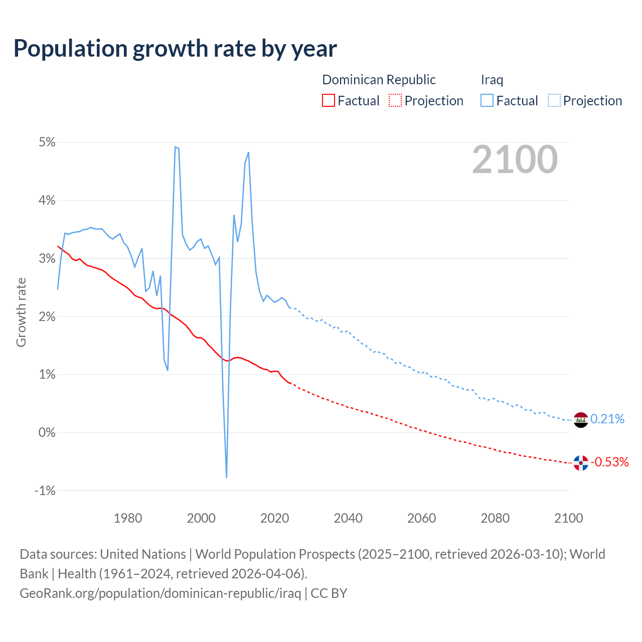 - For the last 10 years, the Dominican Republic has had an average growth rate of +1.04% per year vs +2.45% in Iraq.