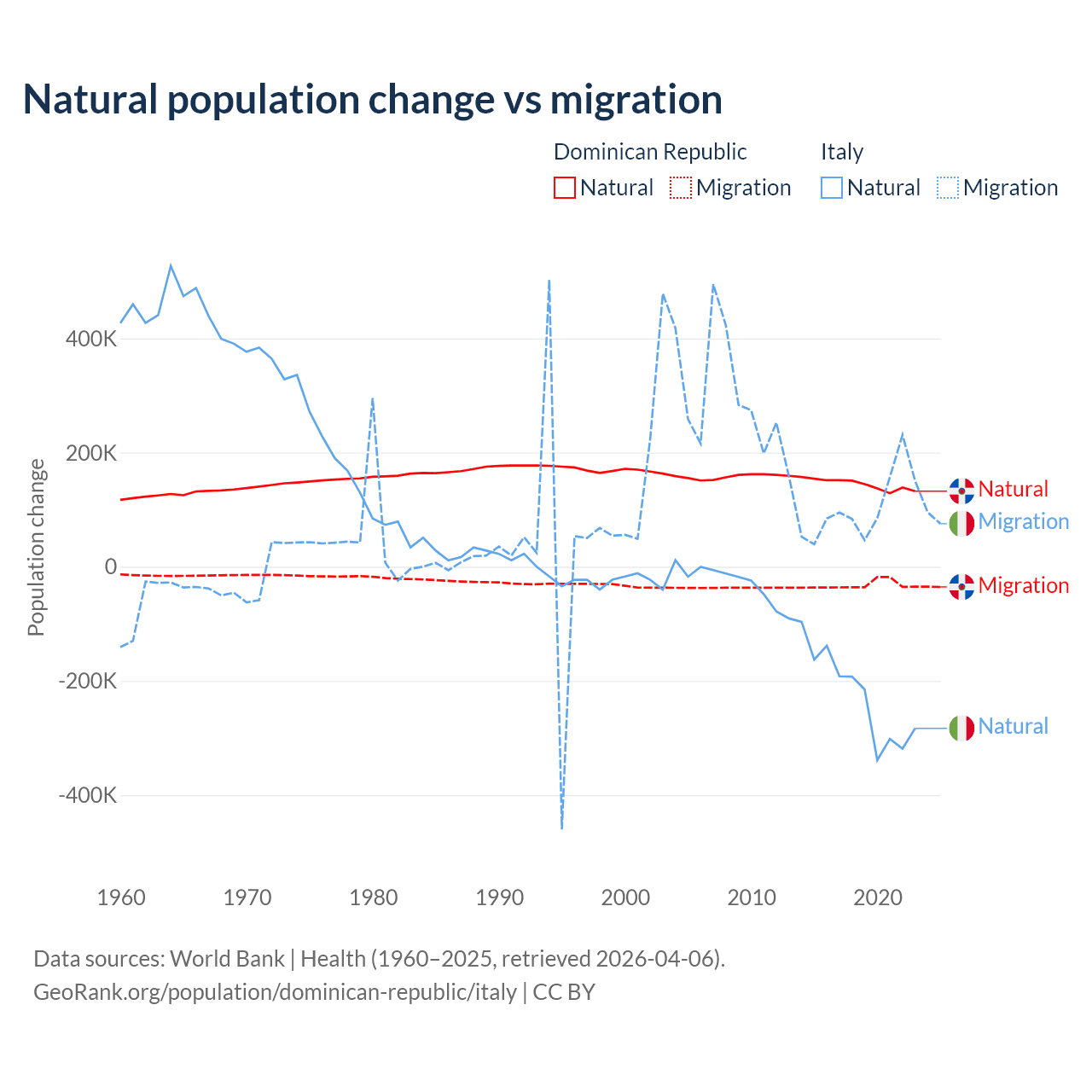 Over the last 10 years, 81.8% of the population change in the Dominican Republic is from natural causes (a gain of 1,447,764 people) and 18.2% is from migration (a loss of 322,919 people). In Italy 68.6% is from natural causes (a loss of 2,239,084 people) and 31.4% is from migration (a gain of 1,026,128 people).