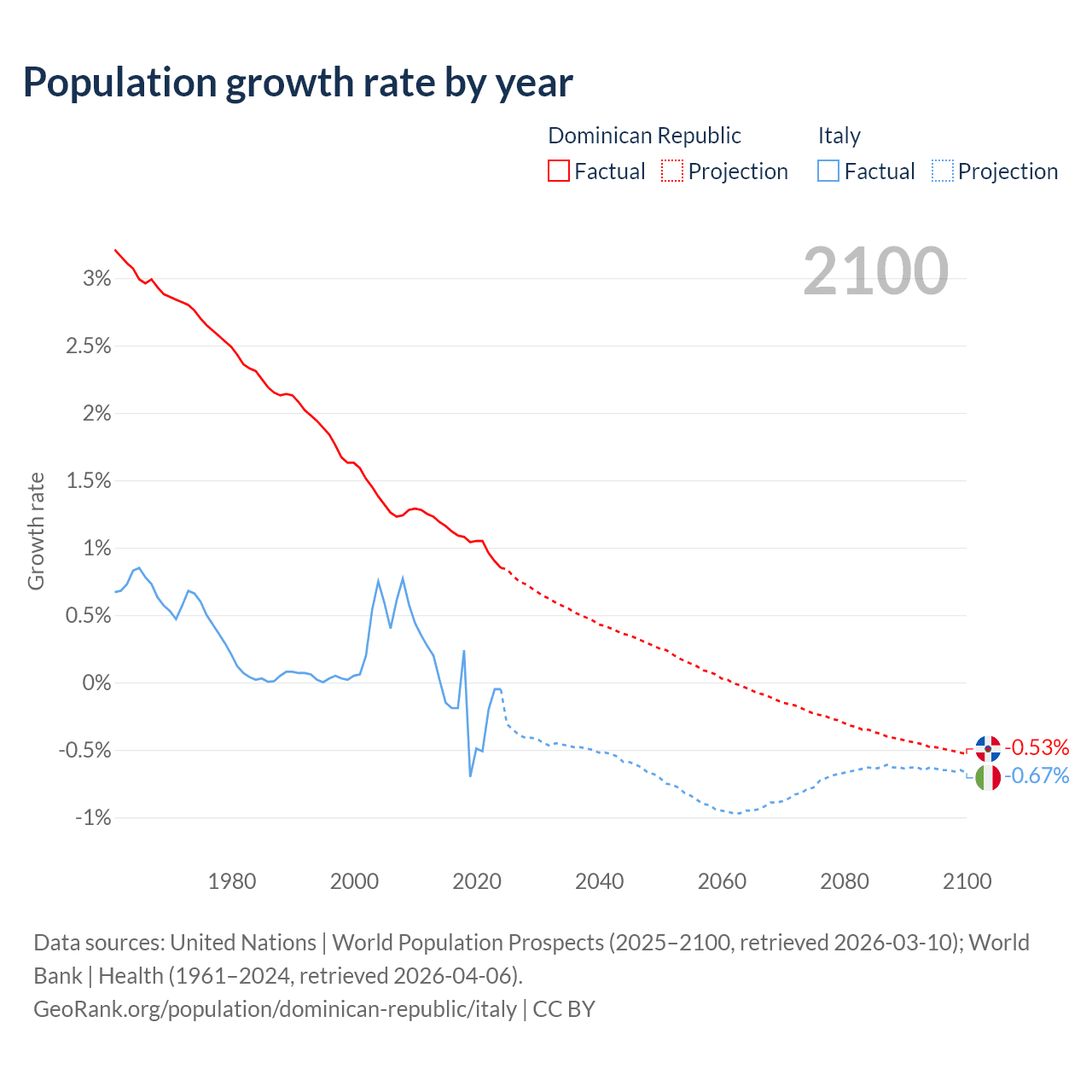 - For the last 10 years, the Dominican Republic has had an average growth rate of +1.04% per year vs -0.21% in Italy.
