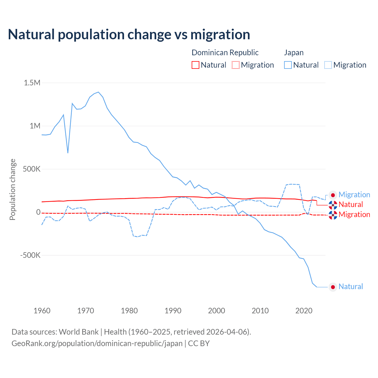 Over the last 10 years, 81.8% of the population change in the Dominican Republic is from natural causes (a gain of 1,447,764 people) and 18.2% is from migration (a loss of 322,919 people). In Japan 73.6% is from natural causes (a loss of 5,178,838 people) and 26.4% is from migration (a gain of 1,860,103 people).