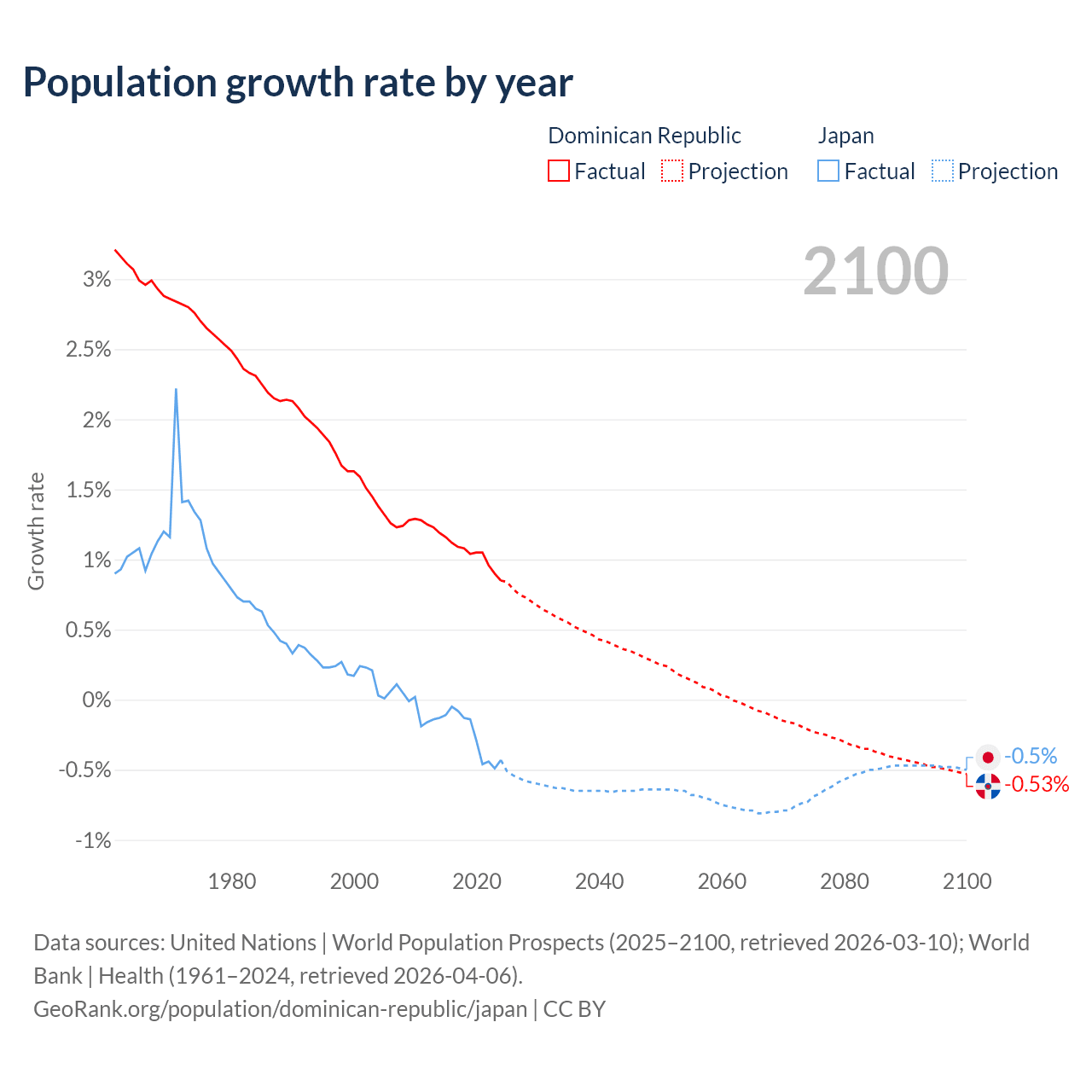 - For the last 10 years, the Dominican Republic has had an average growth rate of +1.04% per year vs -0.25% in Japan.