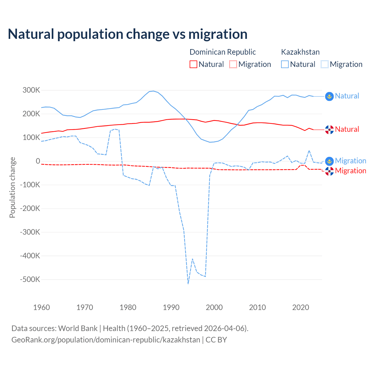 Over the last 10 years, 81.8% of the population change in the Dominican Republic is from natural causes (a gain of 1,447,764 people) and 18.2% is from migration (a loss of 322,919 people). In Kazakhstan 98.7% is from natural causes (a gain of 2,743,094 people) and 1.33% is from migration (a gain of 36,908 people).