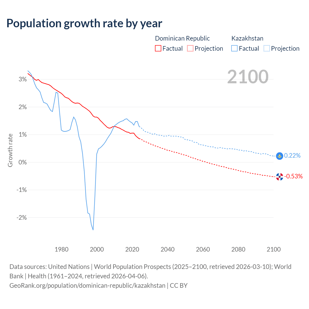 - For the last 10 years, the Dominican Republic has had an average growth rate of +1.04% per year vs +1.46% in Kazakhstan.