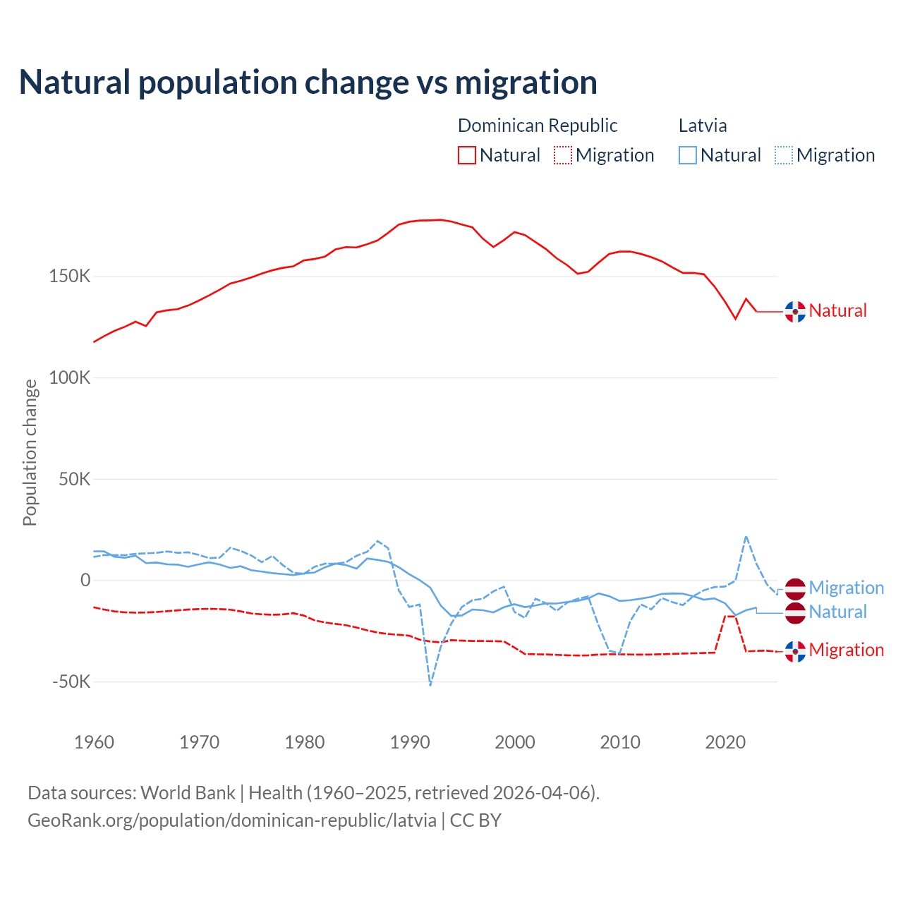 Over the last 10 years, 81.8% of the population change in the Dominican Republic is from natural causes (a gain of 1,447,764 people) and 18.2% is from migration (a loss of 322,919 people). In Latvia 82.7% is from natural causes (a loss of 103,711 people) and 17.3% is from migration (a loss of 21,641 people).