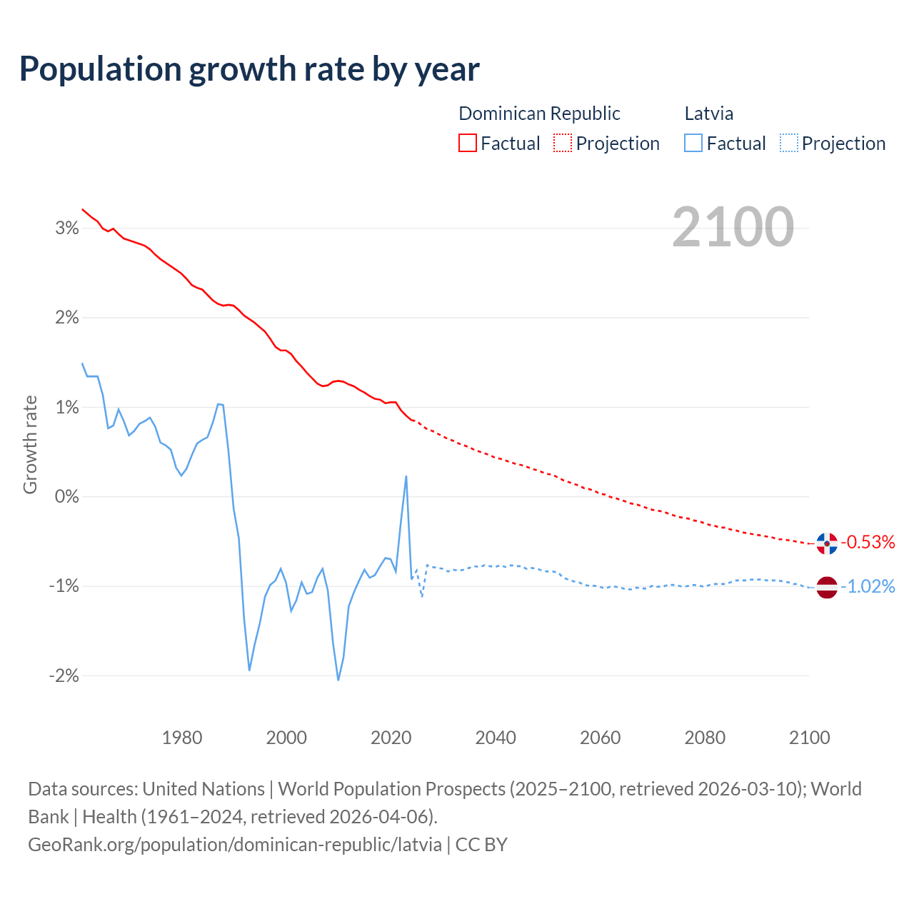 - For the last 10 years, the Dominican Republic has had an average growth rate of +1.04% per year vs -0.68% in Latvia.